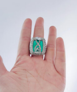Our championship rings are meticulously created by our artisans. We use a copper base, which takes longer and requires more effort, but produces crisper details and a brighter final plating. 18k White Gold, Yellow Gold, or a combination of both is used depending on the ring. The diamonds are AAA-grade cubic zirconia that has been hand placed.
