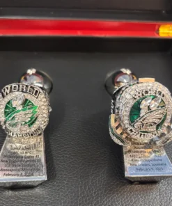 Our championship rings are meticulously created by our artisans. We use a copper base, which takes longer and requires more effort, but produces crisper details and a brighter final plating. 18k White Gold, Yellow Gold, or a combination of both is used depending on the ring. The diamonds are AAA-grade cubic zirconia that has been hand placed.